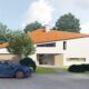 Projekt przebudowy oraz rozbudowy istniejącego budynku jednorodzinnego wolno stojącego z garażem wbudowanym. Plan budynku jest nierównoległy wynikający z układu obowiązującej linii zabudowy.